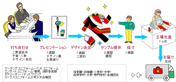 マーチングバンドユニフォームのオーダーシステム A カスタムオーダー チームの個性を豊かにアピールする、世界に一つだけのオリジナル、マーチングバンドユニフォームを創ります。 Bセミオーダー カタログからデザインと素材を選び、色を自由に組み合わせたクオリティの高いマーチングバンドユニフォームを創ります。 Cスタンダード カタログに表示された豊富なデザインの中から選べるクイック、マーチングバンドユニフォ ームをお届けいたします。